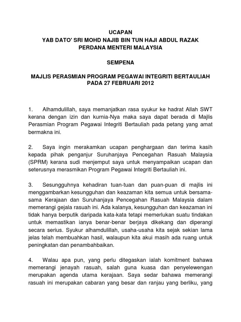 Alhamdullilah kita bersyukur kepada Allah SWT kerana kita dapat bersua pada malam ini. Berikut adalah teks penuh ucapan khas Perdana Menteri Datuk Seri Najib Tun Razak tentang Pengubahsuaian Bajet 2016 Hal 1. Namun semuanya perlu bermula daripada pembudayaan integriti.
